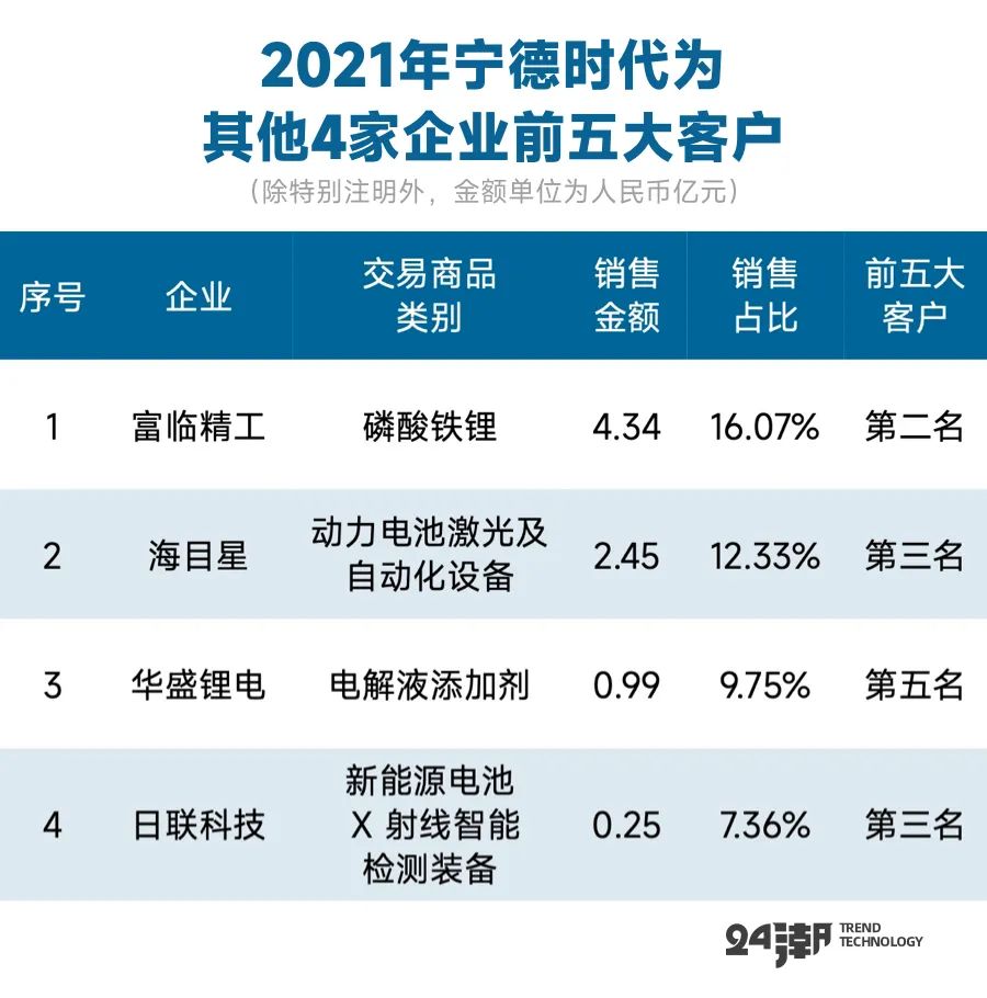 据24潮统计,目前在新能源汽车全产业链上约有160余家上市/IPO公司,而宁德时代至少是其中30家企业的前五大客户,宁德时代2021年向这30家企业总采购额合计近470亿元左右,占这些企业2021年总营收的比例约为43.52%。