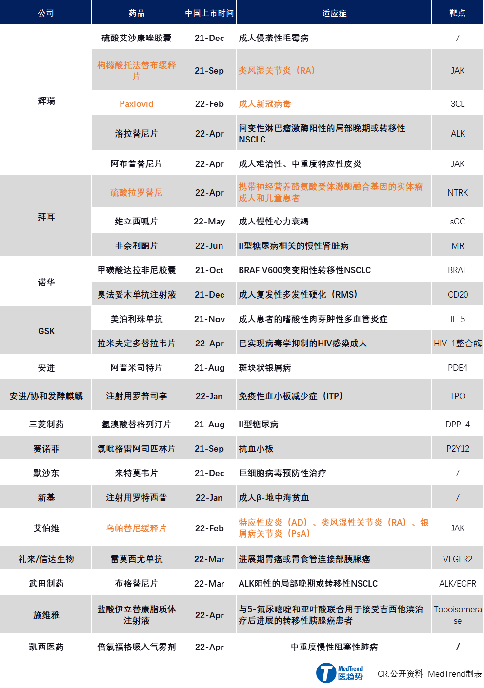 辉瑞在外企中领衔,有5款新药,包括备受瞩目的新冠口服药Paxlovid、今年4月国内获批的第二代JAK抑制剂阿布昔替尼。