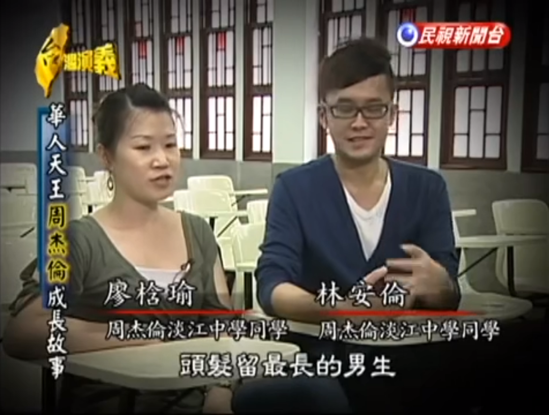 “他可能是淡江中学头发最长的男生。”有同学这么评价他。有一次老师经过大礼堂,听到人在里面弹爵士乐版的国歌,拉门一看是周杰伦。
