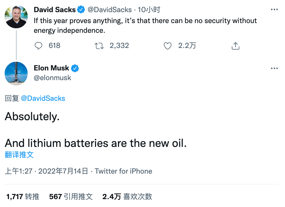 随后,特斯拉CEO埃隆·马斯克,在该条推文下回复称:“绝对的。锂电池就是新的石油。”