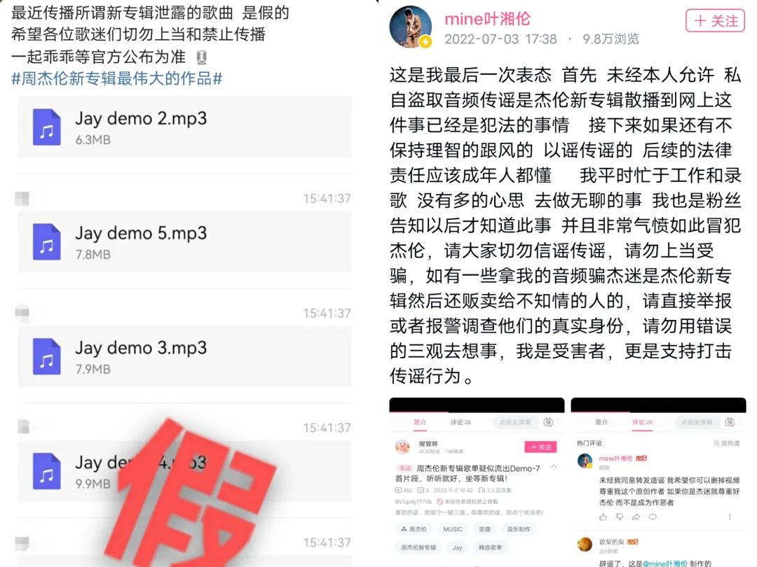相比起部分听众的偏听偏信,专辑团购群内的杰迷俨然资深老粉,通过唱腔、咬字等细节辨别:“这不是杰伦,你听他唱就感觉舌头是弯的”,“周游的咬字有些故意,很不像”,“曲风很像Q音三巨头”。粉丝们纷纷在群内号召其他人一起去各个社交媒体“打假”,随着参与粉丝越来越多,demo原作者B站UP主“mine叶湘伦”很快在B站公开发表声明,这场乌龙也因此得以平息。