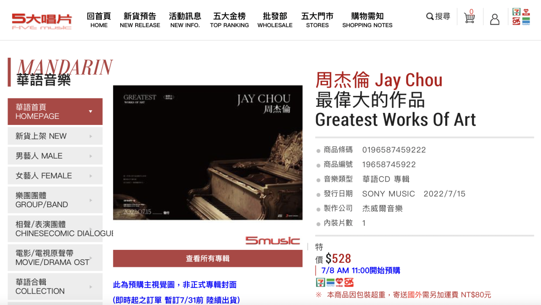 周杰伦《最伟大的作品》除了数字专辑之外,也有实体专辑。杰迷们可以自己在五大唱片官网上购入,官网售价528台币(约合人民币119元),也可以在淘宝上找代购。在淘宝上搜索“周杰伦新专辑”,你会看到不少淘宝商家预售专辑,其中淘宝店“绿村音乐唱片”,专辑售价145元,再额外加10元邮费,月销量已达1000+。