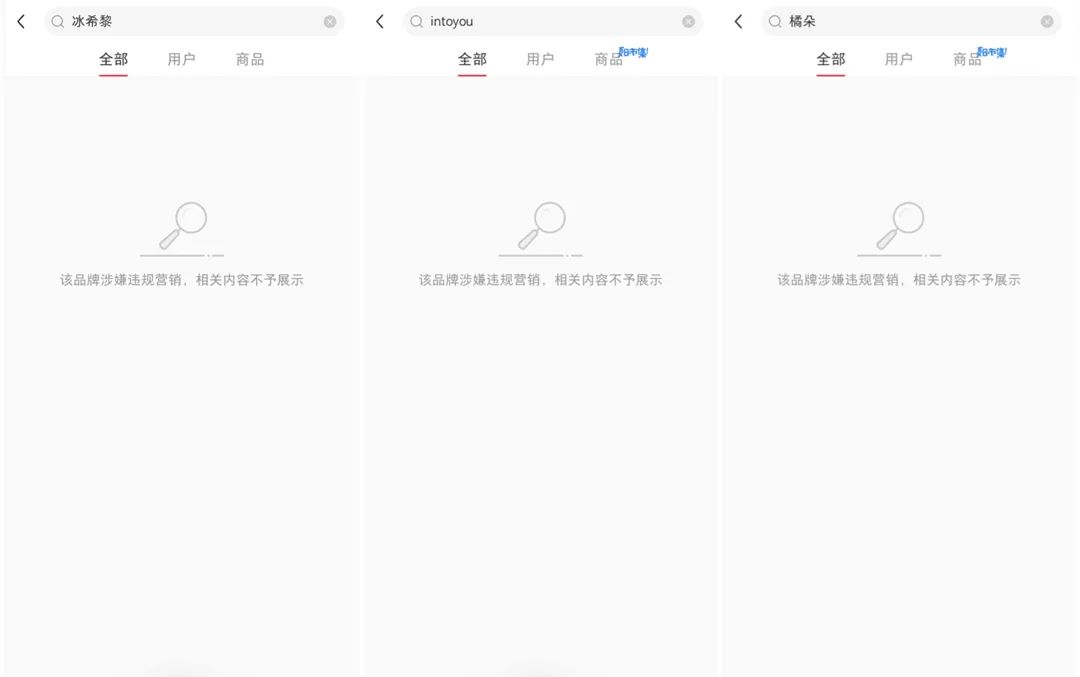 以这几个品牌名为关键词,在小红书平台上已经搜索不到相关的“种草”笔记,仅出现了“该品牌涉嫌违规营销,相关内容不予展示”的界面。