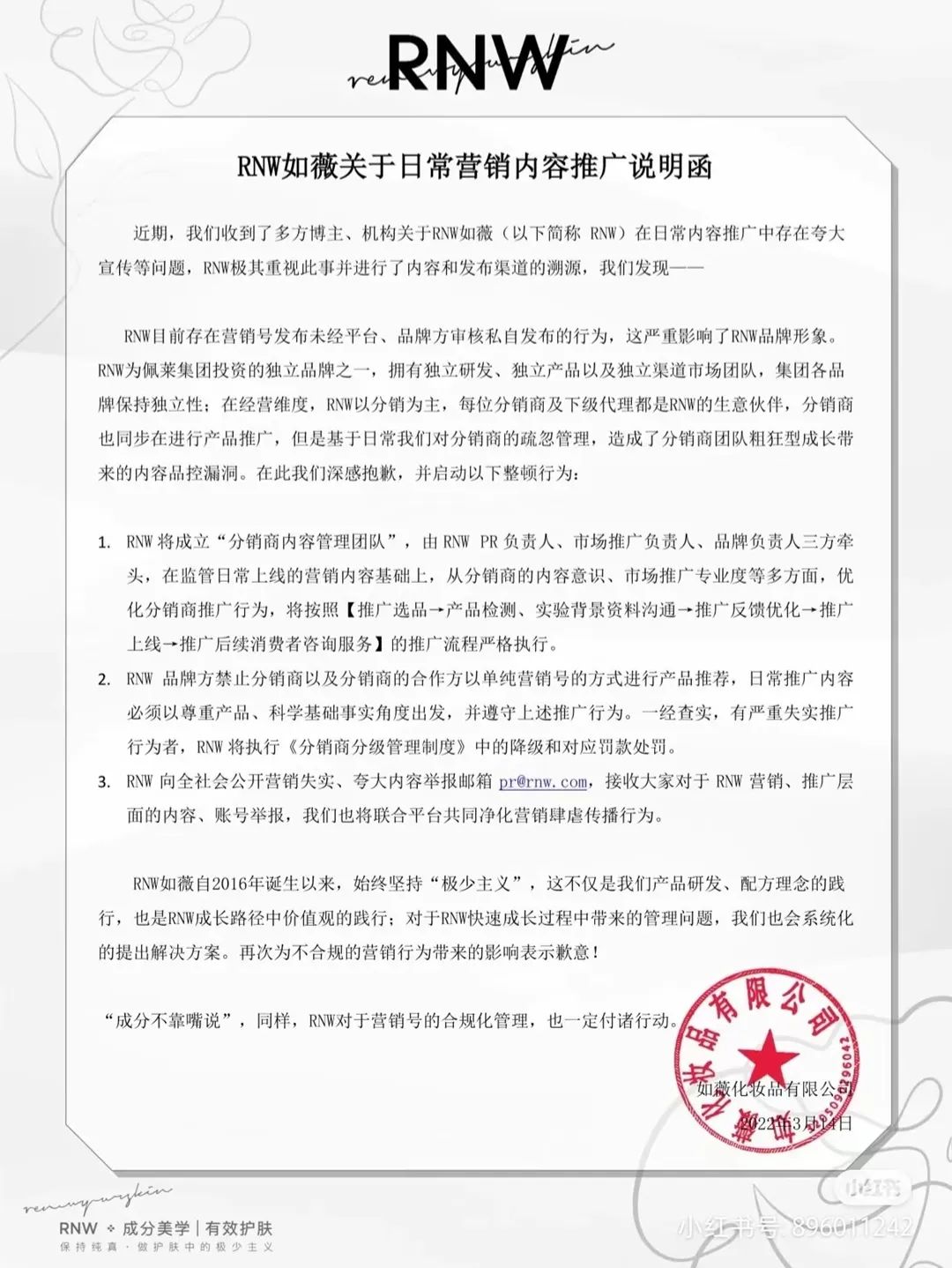 美妆品牌RNW,在3月一解封,就在小红书发布了“RNW如薇关于日常营销内容推广说明函”的公告,表示将成立“分销商内容管理团队”,监管日常的营销内容,并优化分销商推广行为。