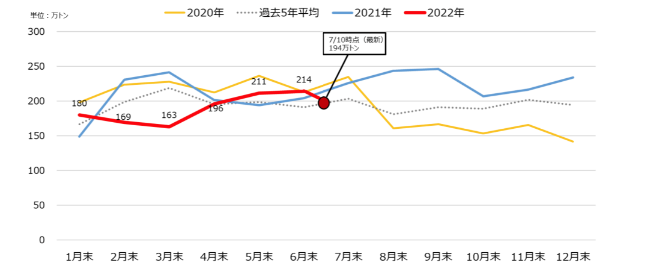 由于日本没有欧洲常见的地下存储设施,日本的LNG库存仅够使用两到三周。目前,日本LNG库存与往年同期相比处于较低水平。