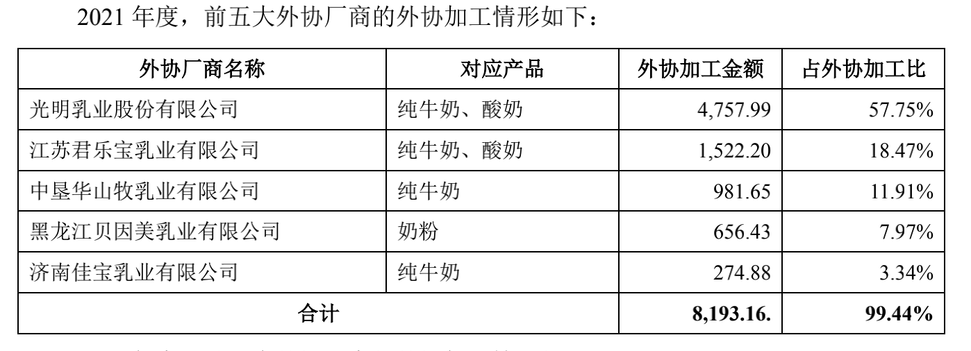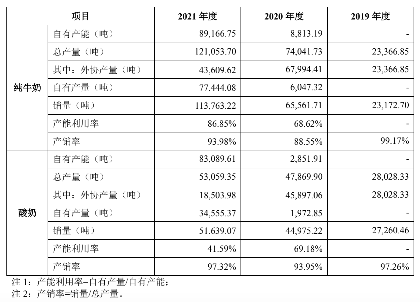 根据说明书显示,公司采用自主生产和外协加工结合的生产模式,2021年前五大外协厂商分别为光明乳业、江苏君乐宝乳业有限公司、中垦华山牧乳业有限公司、黑龙江贝因美乳业有限公司、济南佳宝乳业有限公司,前五家外协加工占比达到了99.44%,外协加工金额8193.16万元。2021年认养一头牛的纯牛奶自产7.74吨,外协产量4.36吨,外协产品占比36.03%;酸奶自产3.46吨,外协产量1.85吨,外协产品占比34.87%,比例都不算小。从产能利用率来看,2021年纯牛奶的产能利用率86.85%,酸奶41.59%,至少纯牛奶业务需要外协生产才能满足市场。