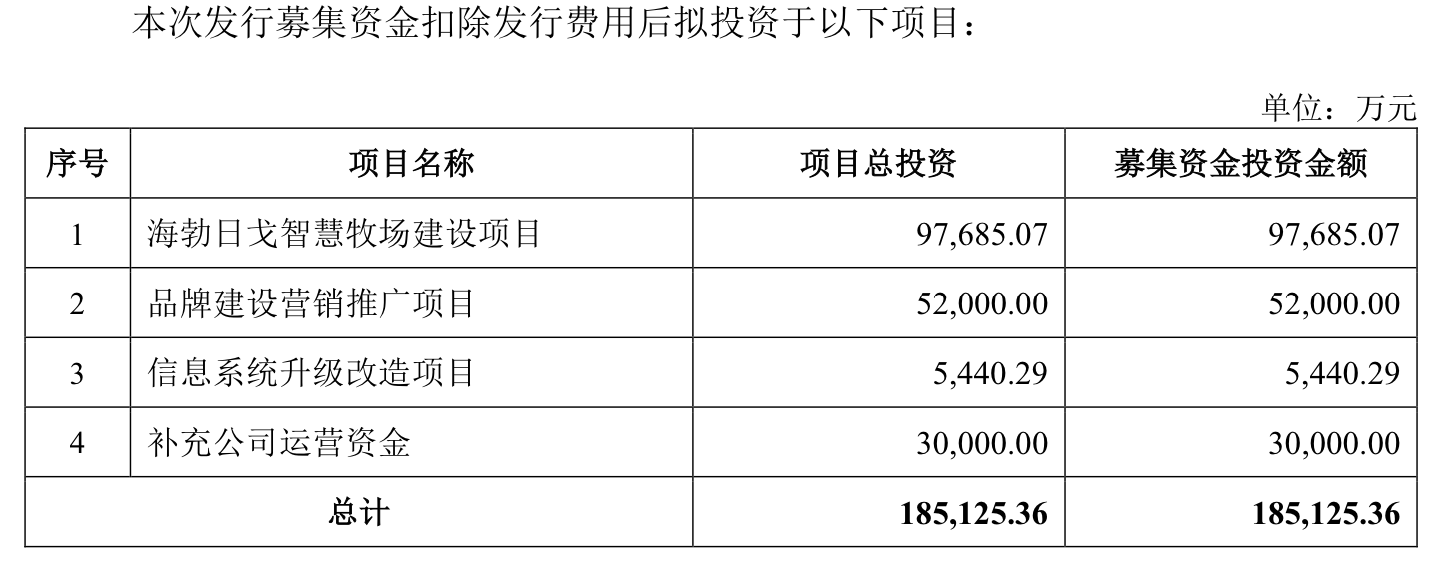 比如募集投资项目中的“海勃日戈智慧牧场建设项目”,拟投入金额接近10亿元,公司称,该项目拟在吉林省松原市建设智慧牧场,通过引进一批荷斯坦奶牛,购置先进的智慧牧场管理系统及其他配套的功能设备,能进一步提高公司生牛乳的自给能力;优化牧场管理的自动化程度,有效降低运营成本,提升公司的盈利水平,形成规模效应,增强公司在乳制品行业整体竞争力。