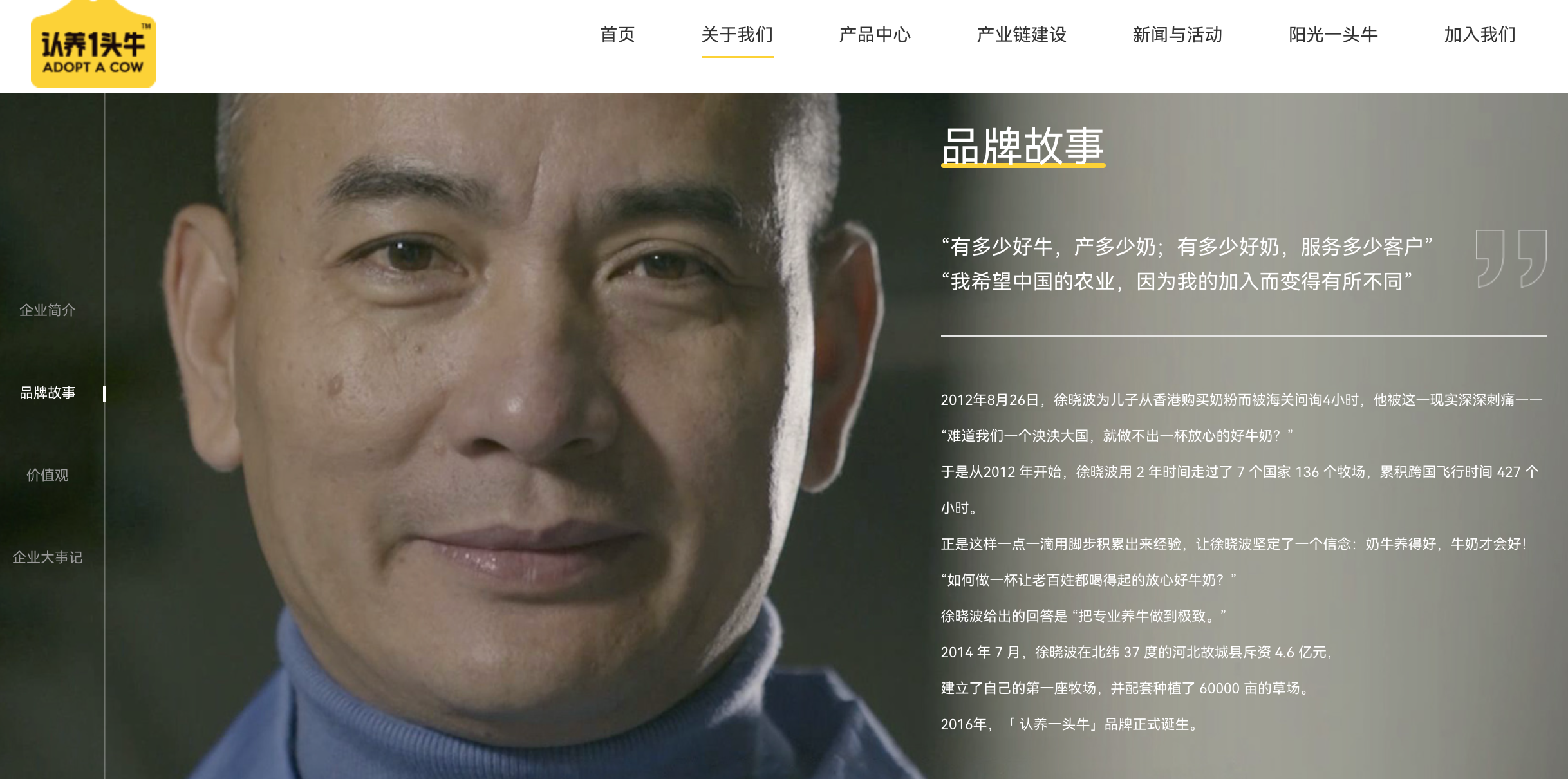 通过百度,很容易查到徐晓波创业的心路历程。网传,2012年,徐晓波到中国香港买奶粉,因不了解限购令,被海关问询了整整4个小时,之后还写下了长长的保证书,这次经历让徐晓波琢磨跨界(据传在此之前徐晓波的身份还是地产商),提出“买牛奶,不如认养一头牛”,养牛的故事就开始了。