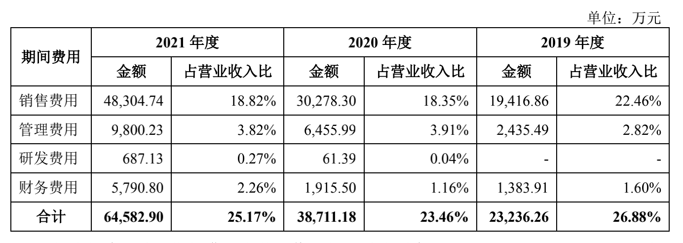 收入猛增但净利润跟不上也体现在毛利率数据上。2019年至2021年,公司主营业务毛利率分别为40.95%、30.79%和28.86%。2021年毛利率下降,公司解释主要是原材料价格上升以及产品价格调整所致。不过将2019年运费合并至主营业务成本后,各期主营业务毛利率分别为29.05%、30.79%和28.86%,看起来就平滑不少。