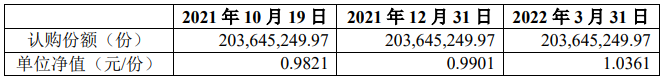文峰电子商务认购守朴基金份额的确认日为2021年10月19日,自该基金认购以来,文峰电子商务从基金管理人处收到三次关于该基金的净值情况,2021年10月19日单位净值为0.98元/份、2021年末为0.99元/份、2022年一季度末为1.04元/份。