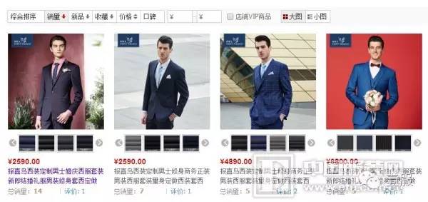报喜鸟天猫官方旗舰店上的西服私人订制定价从2590元至11800元不等,主要差别在定制面料上,大多数款式目前销售件数为0,有部分销售数量为1-5件不等,销售最高的一款为报喜鸟新郎结婚礼服男装修身套西定做,价格为2590元,即价格最低款,共销售14件(图5第一款)。也从侧面反映出线上销售以平价为主,大多数线上消费者不是高富帅,更不是富二代或暴发户,也为后续天猫定制品牌进一步大规模拓展定制市场指明了方向。