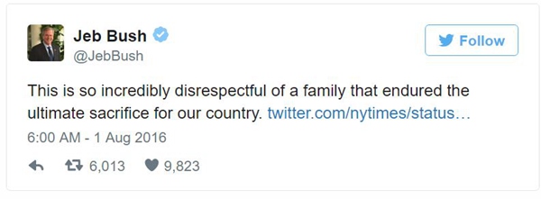 特朗普在党内的对手杰布·布什立即在Twitter上发文称这是对一个“为我们国家做出最高牺牲的家庭的无礼行为”。
