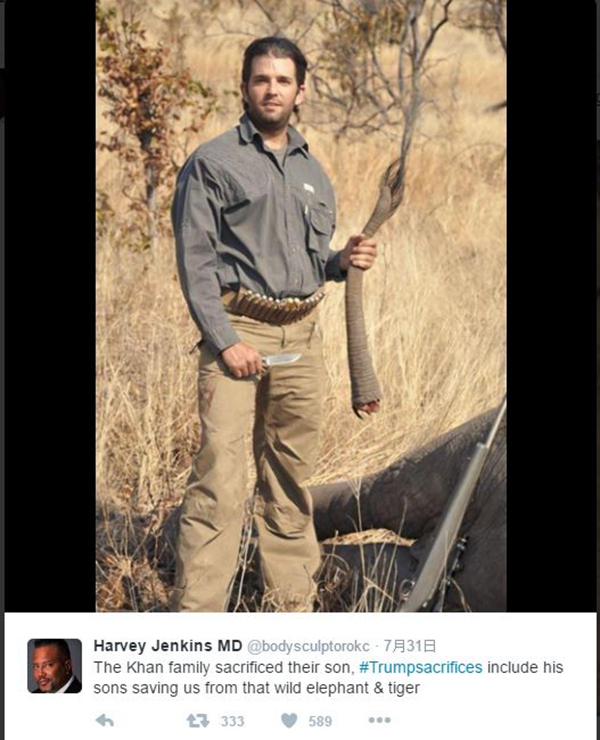 同时网友们还在Twitter上设立了一个“特朗普牺牲”(#TrumpSacrifices)的标签对他进行调侃。有网友放出了特朗普儿子在非洲狩猎的照片,说特朗普的牺牲包括了“他儿子把大家从野生大象和老虎手中解救出来”。