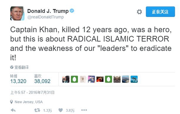 上周四,在民主党全国大会上,一名阵亡陆军上尉的父亲发表讲话,质疑特朗普禁止穆斯林入境的政策,称如果是特朗普当总统,他的儿子根本就没有机会为美国效力。