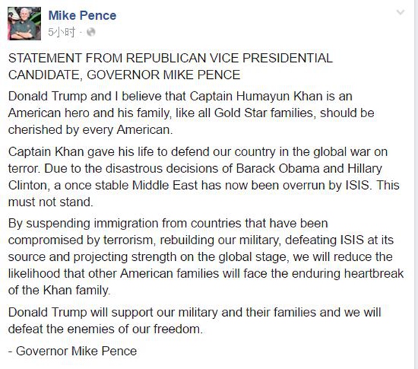 最终在周日晚上,特朗普的竞选搭档、印第安纳州州长彭斯(Mike Pence)在Facebook上发表了正式声明,称“特朗普和我都认为”希尔的儿子是美国英雄,而希尔一家应该得到每个美国人的关爱。
