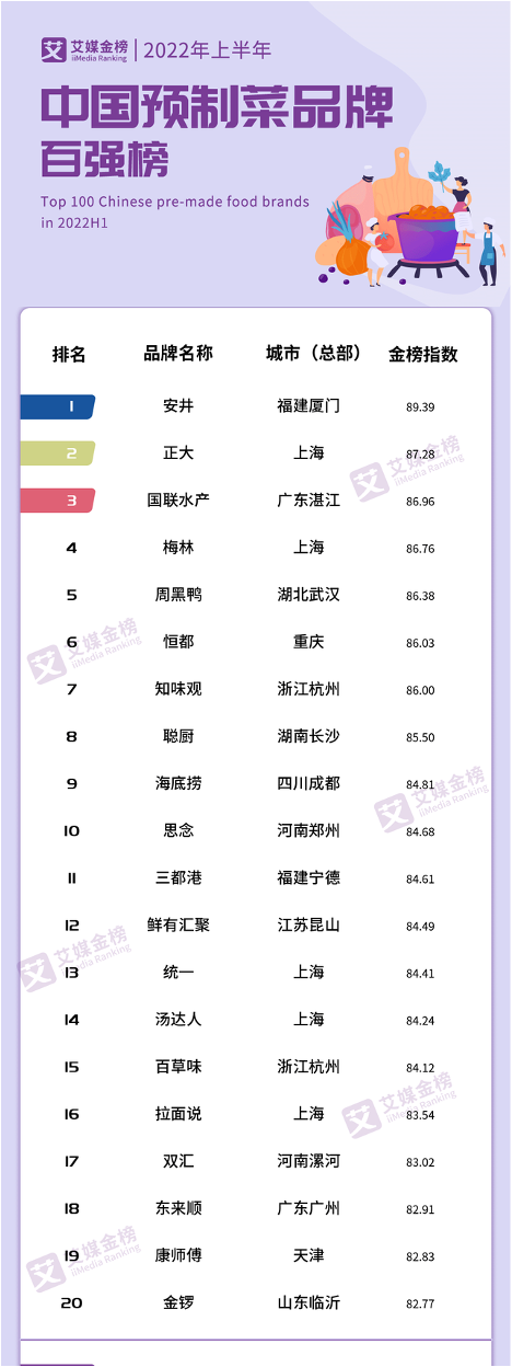 根据艾媒发布的《2022年上半年中国预制菜品牌百强榜》,安井、正大、国联水产、味知香、梅林、海底捞等品牌上榜。