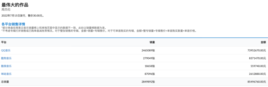 数据显示,在7月14日晚上10点,也就是正式上线的半小时后,售价30元一张的《最伟大的作品》数字专辑在QQ音乐、酷狗音乐、酷我音乐、咪咕音乐等总销售额破亿元。