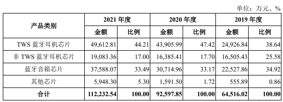 公司目前主要产品线包括TWS蓝牙耳机芯片、蓝牙音箱芯片和非TWS蓝牙耳机芯片,分别占营收的44.21%、17%和33.49%。