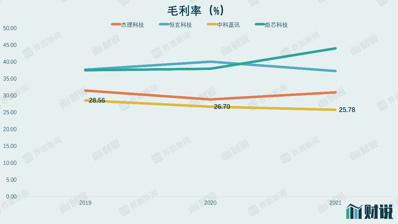 从体量看,杰理科技、恒玄科技(688608.SH)2021年收入分别为24.6亿元和17.7亿元,均高于中科蓝讯;炬芯科技(688049.SH)2021年收入为5.3亿元,规模相对较小。