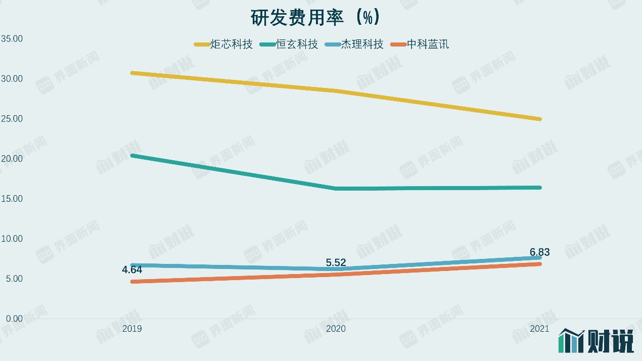 研发方面,中科蓝讯投入相比同行也显不足,2021年公司研发费用率为6.83%,低于所有可比公司。