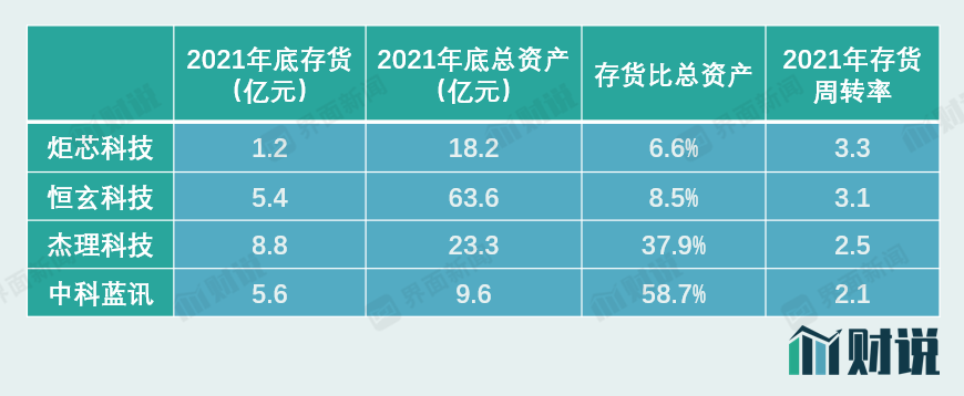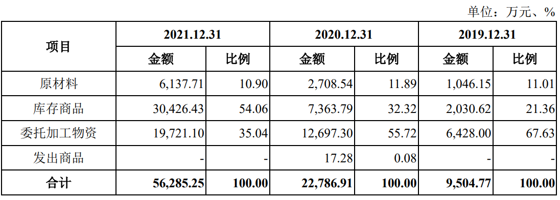 此时手握巨额存货的中科蓝讯处境尴尬。一方面,公司现有存货中以库存商品为主,即芯片成品,公司库存商品占存货比例从2019年底的21.36%上升至2021年底的54.06%。