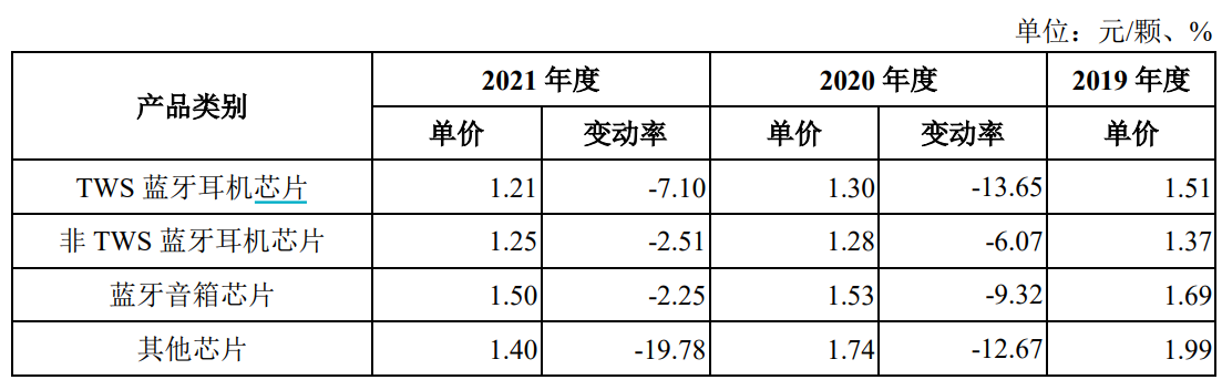 另一方面,公司产品寿命周期不长,单价逐年下滑,以TWS蓝牙耳机芯片为例,公司产品单价在2020年和2021年分别下降13.62%和7.1%,考虑到芯片的推陈出新,同款芯片单价跌幅可能更大。