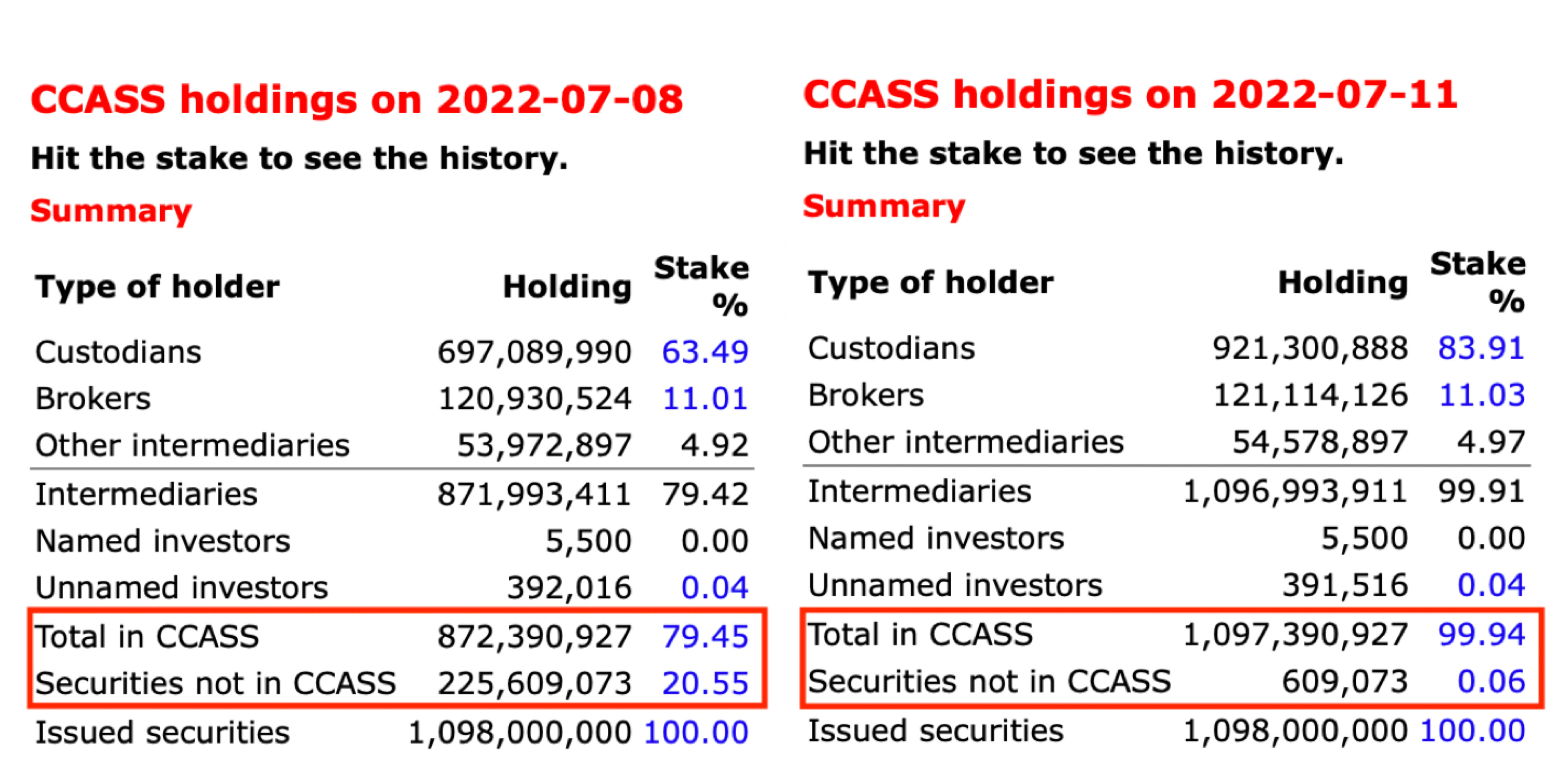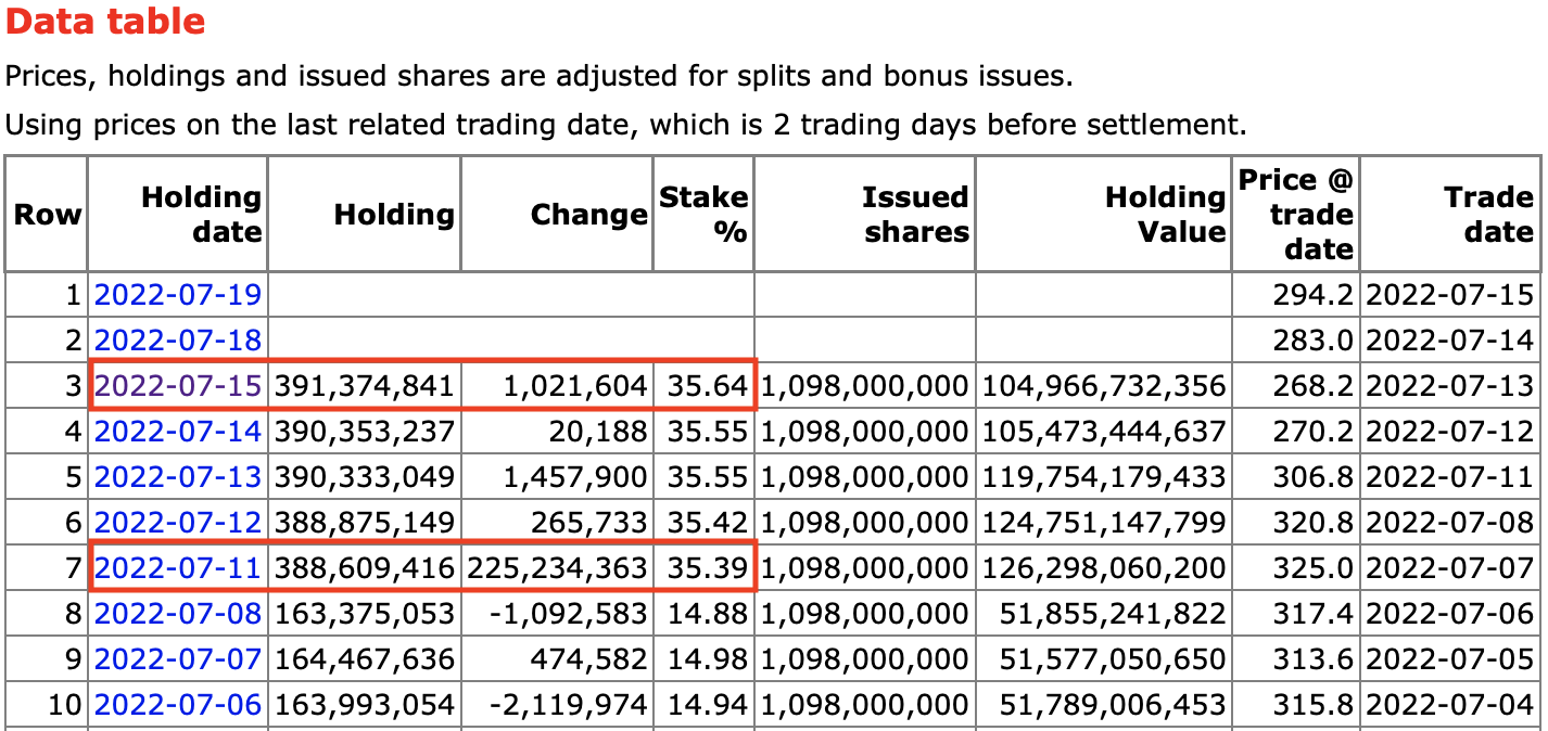 据了解,香港的股票分为实物股票和电子股票,大部分情况下大股东或者长期股东都持有实物股票,而其他股东如散户或机构都持有电子股票。电子股票就是经过银行或券商渠道买入或持有的股票(亦可以理解为银行或券商代客持有股票)。如下图所示,Securities not in CCASS就是实物股票,而Total in CCASS就是电子股票。7月11日,有2.25亿股比亚迪H股由实物股票转化为电子股票。