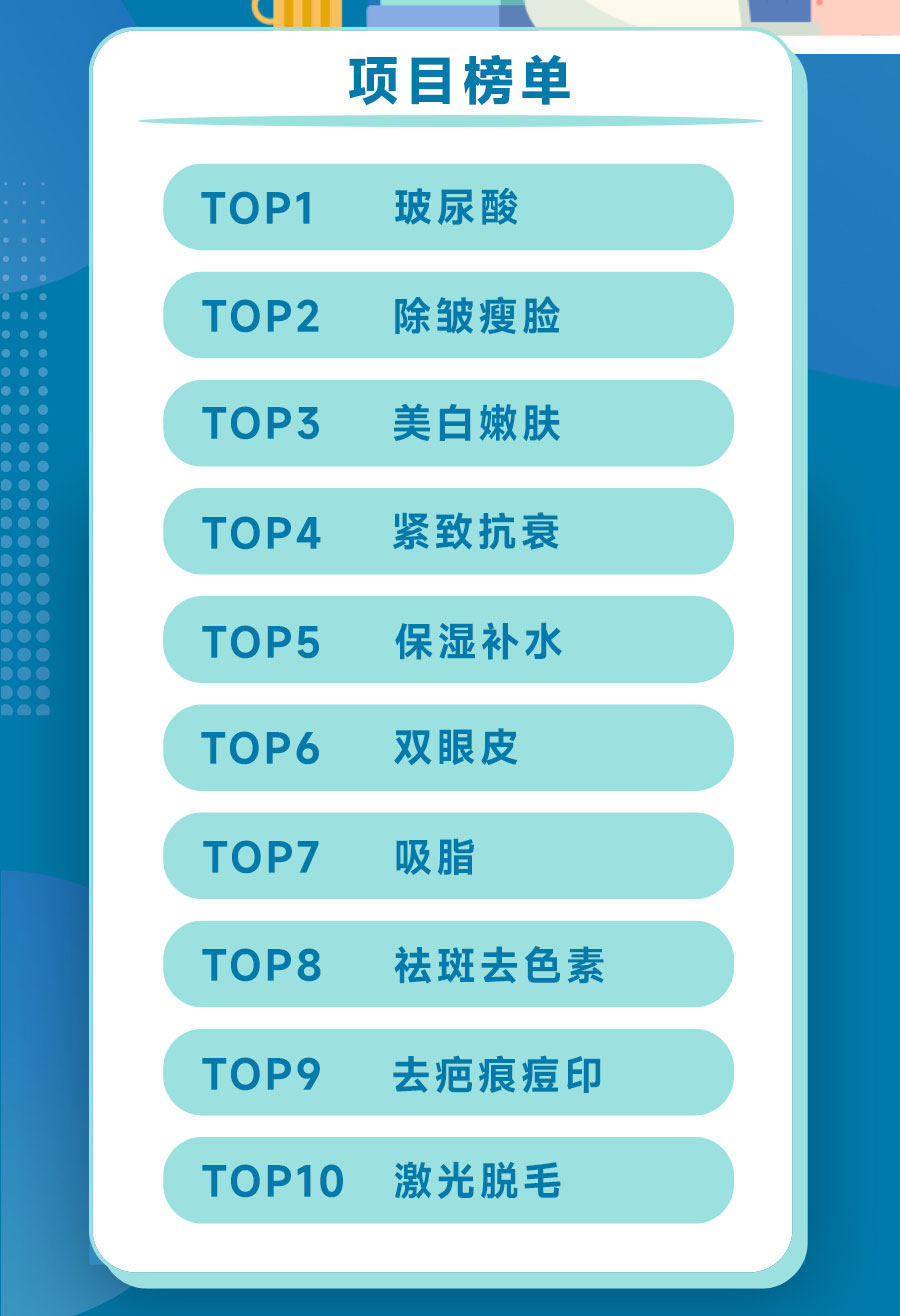 具体而言,美沃斯期间,美商研究院发布的2022年6月医美消费榜单中,前十名的项目里仅有两个项目为手术类项目,即双眼皮项目,排名第六;以及吸脂项目,排名第八;其余8个项目均为轻医美项目,依次为:玻尿酸、注射瘦脸、美白嫩肤、紧致抗衰、保湿补水、祛斑去色素、祛疤痕痘印和激光脱毛。
