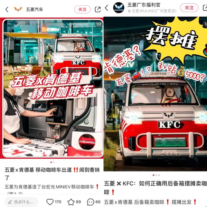 而非咖啡的品牌方也开始关注移动咖啡车。由于“移动咖啡”和“车”的深度绑定,移动咖啡也成为不少对标年轻群体的车企品牌的活动宣传新阵地。今年1月,五菱宏光为肯德基K咖啡,打造一台MINIEV移动咖啡车,成功蹭上热度;4月,西安奔驰经销商将主推某款电动车改造成咖啡车,开上街头吸引打卡;5月,慈溪宝马经销商把移动咖啡车开上山顶,强调其主推车型的越野性能;6月,上汽大众将某车型改造成咖啡野营车,亮相车展,精准定位户外爱好者。
