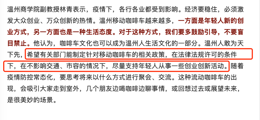 摆在咖啡车面前的最重要高山还是监管制度的完善。目前移动咖啡车因移动售卖,没有固定店铺,被划定在城管部门管辖范围内,作为流动摊贩管理,时常被驱赶。许多咖啡车主均表示,十分期待有关部门出台政策,让咖啡车主明白自己应该申请什么资质,拿到什么认证,才能放心大胆地做生意,而不会被城管赶来赶去。