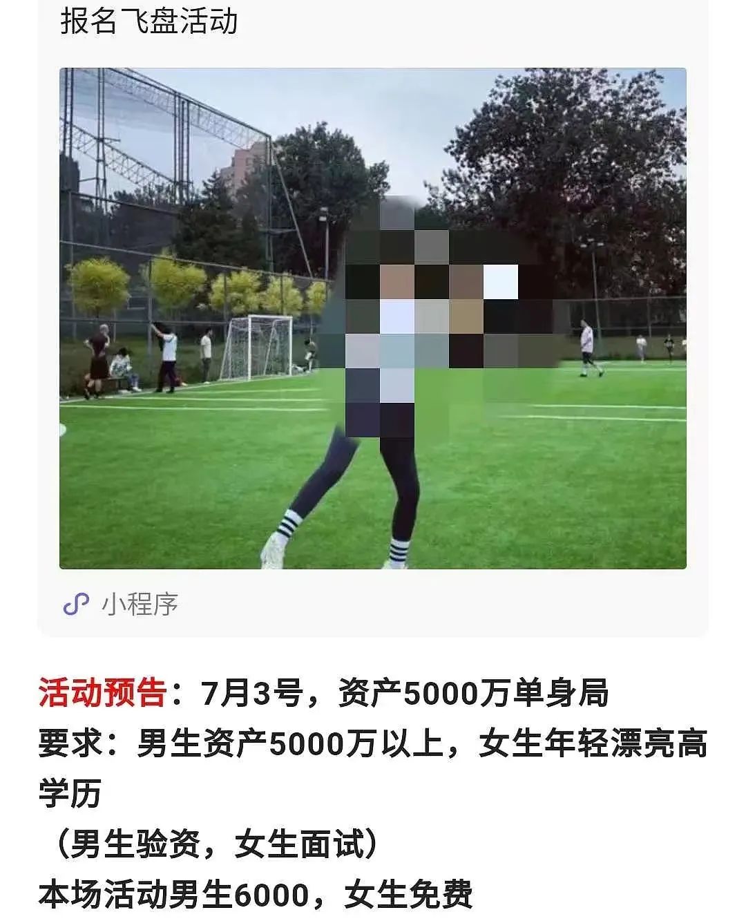 这类男验资、女面试的高端相亲局在市场中一直存在,且按下不表,如今飞盘确实成为不少相亲大号、本地大号组织线下活动的首选。大V卢诗翰称,飞盘大火是相亲赛道对运动赛道的降维打击,不少线下飞盘活动的组织者其实就是相亲组局。硬糖君调查发现,确实有一些飞盘局是相亲机构在操作牵线。