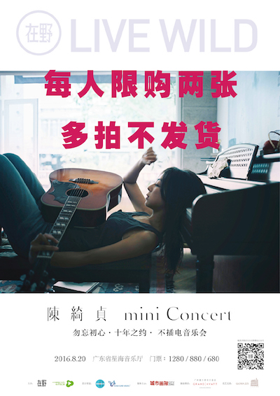 2016年8月20日陈绮贞“勿忘初心·十年之约”广州不插电演唱会,将是陈绮贞第一次来到广东省星海音乐厅这个华丽的千人剧院开唱,超近距离的亲视感和超优质的音效,相信必定会给大家一个毕生难忘的晚上。