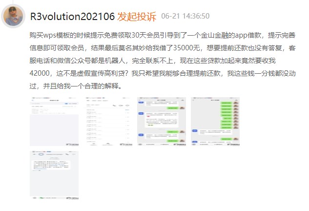 有用户投诉称,自己因为查看了WPS上面“免费送30天会员”的广告,被诱导下载了金山金融APP,结果被要求贷款1万元,才能获得免费赠送的会员权益。