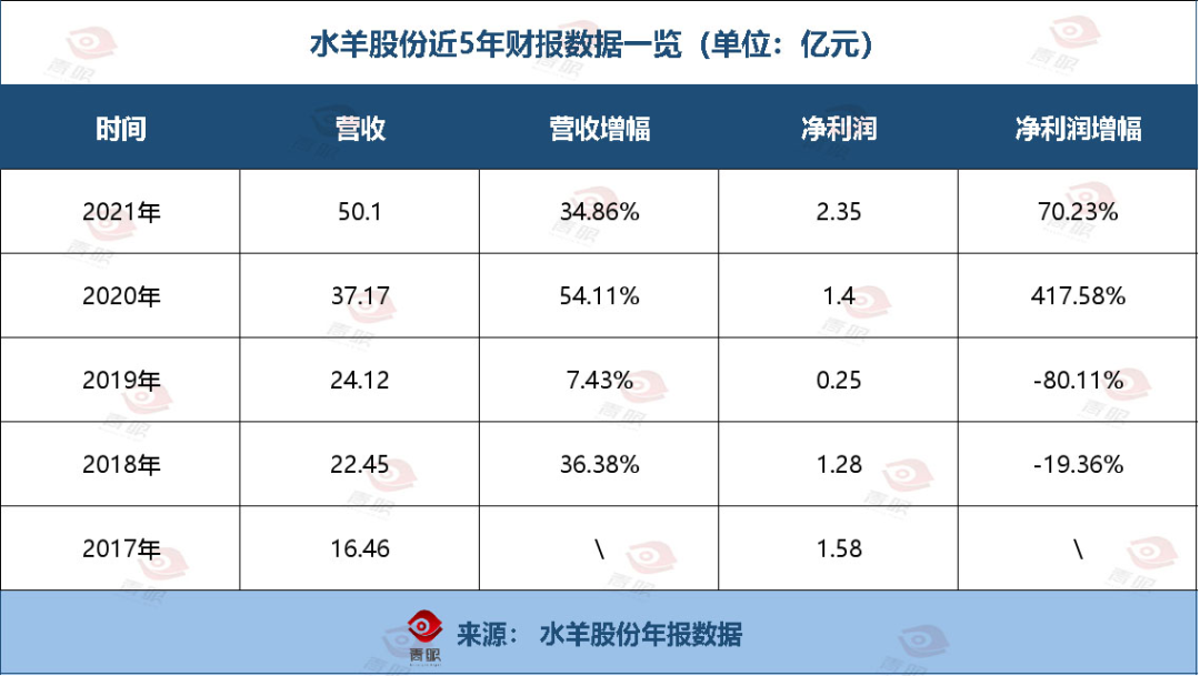 在这种模式下,水羊股份很快扭转了局面。青眼梳理水羊股份财报发现,该公司的营收从上市前的16.46亿元(2017年)一路增加至2021年的50.10亿元,5年间业绩增长了2倍。