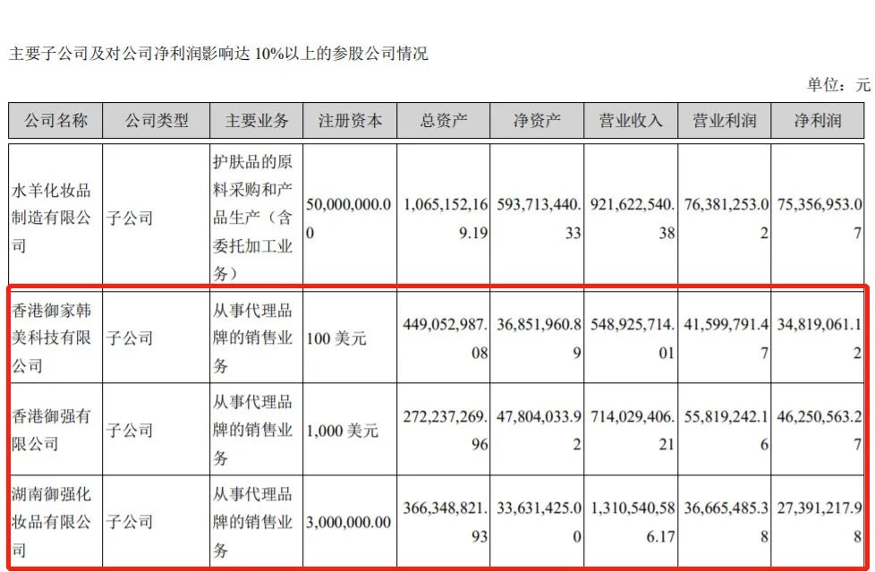 根据水羊股份2021年年报显示,水羊化妆品制造有限公司、香港御家韩美科技有限公司、香港御强有限公司、湖南御强化妆品有限公司等4家子公司,对公司净利润的影响达10%以上。