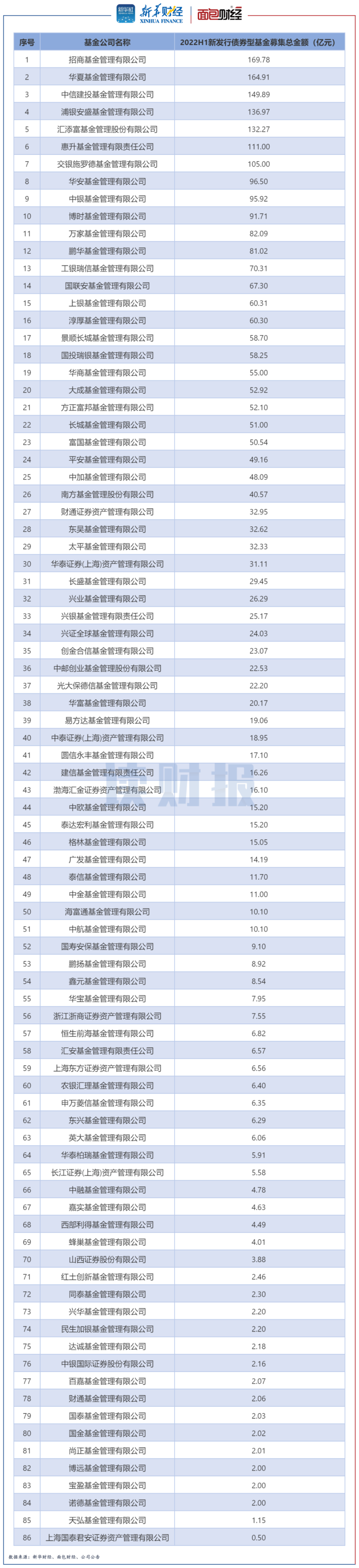 2022年上半年,招商基金、华夏基金、中信建投基金等7家基金公司新发行的债券型基金产品募集总金额超100亿元,发行规模居前。