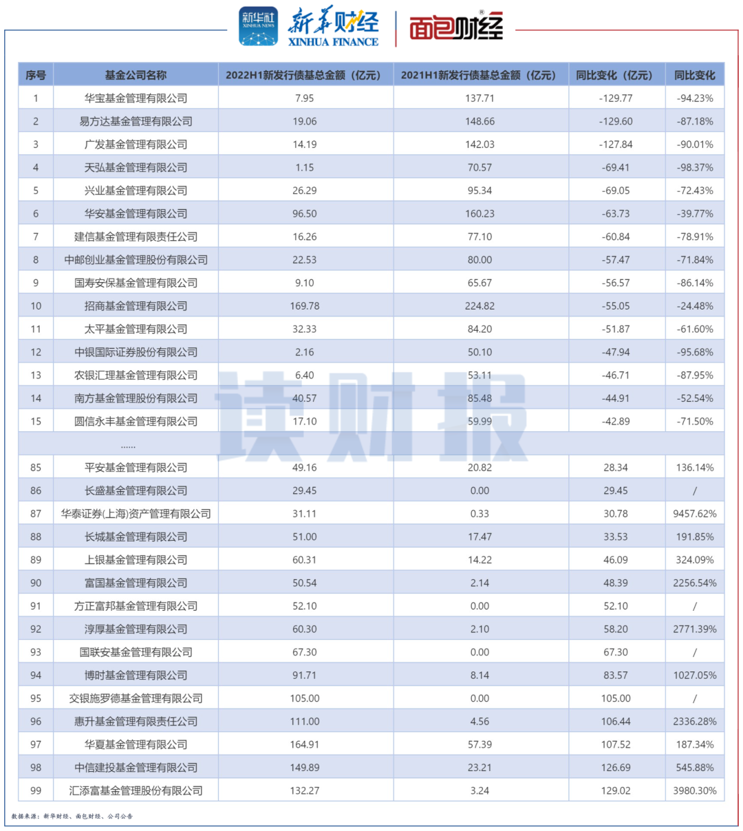 华宝基金上半年债券型基金新发行规模较2021年同期减少近130亿元,减少最为明显。