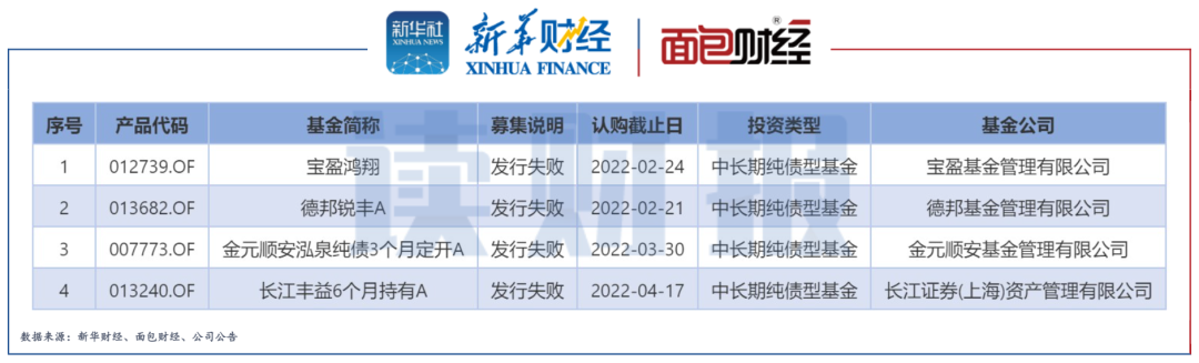 2022年上半年,共有宝盈基金、德邦基金、金元顺安基金和长江证券资管4家基金公司的4只债券型基金产品(初始基金,下同)发行失败。