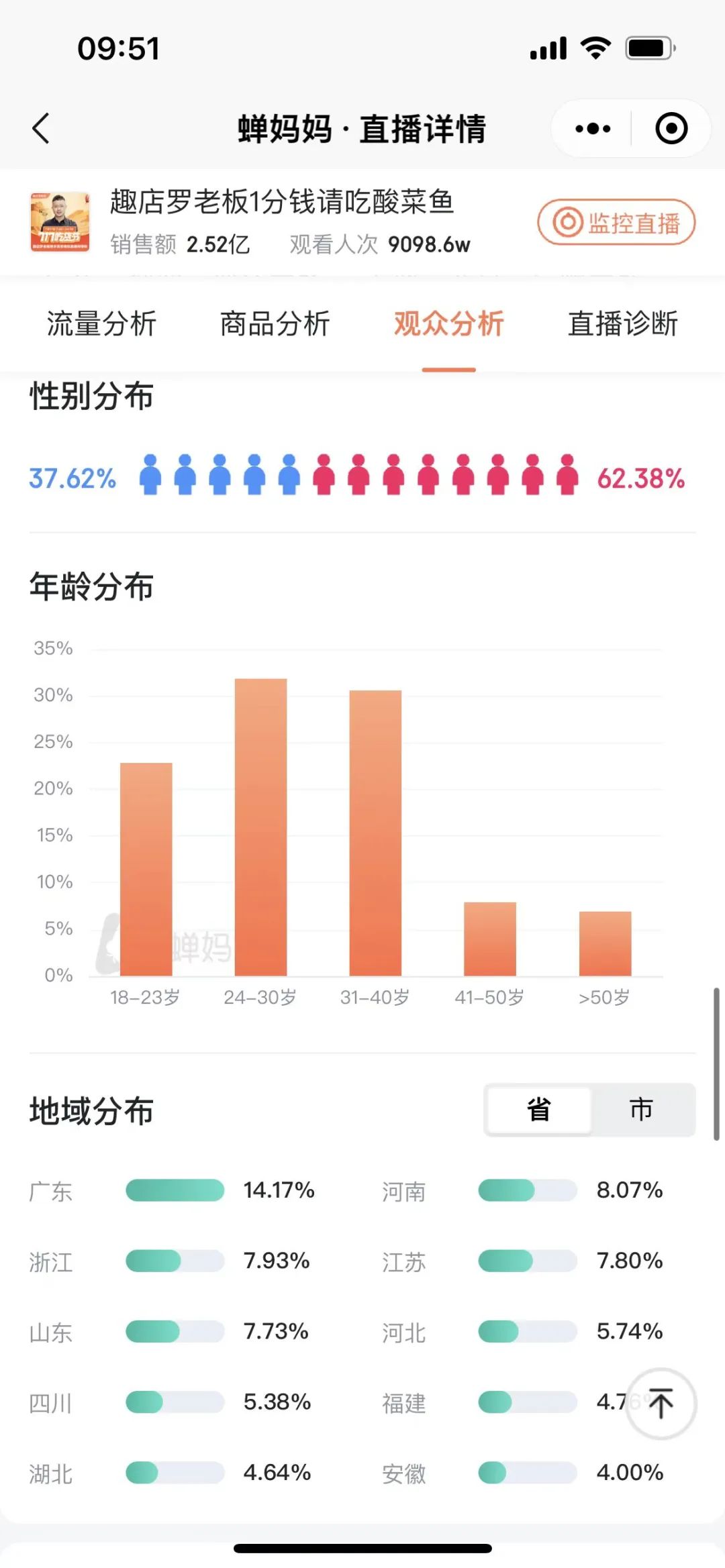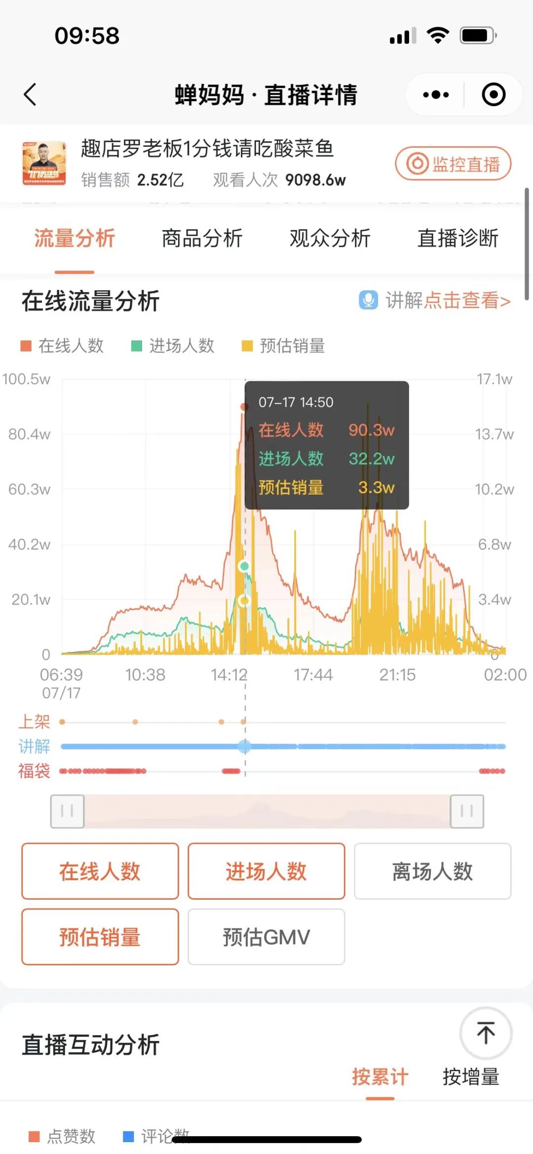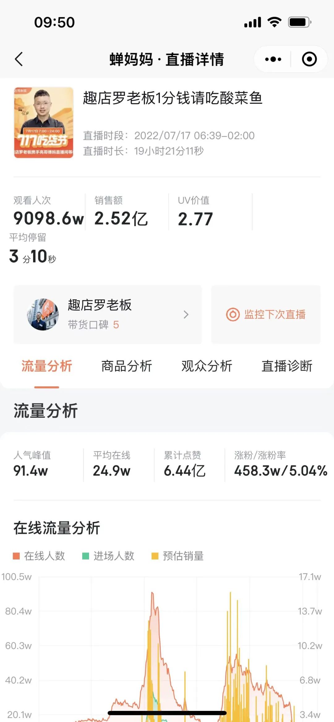 7月17日趣店罗老板从早上6点半就开始了直播,累计直播时长达到19小时21分,马拉松式的直播也为这场直播创造了惊人的成绩,根据蝉妈妈显示,单场累计销售额达到2.5亿,累计观看人次达到9098.6万,累计点赞数6.44亿,单场直播销量达到863.1万,直播新增粉丝达458.3万。