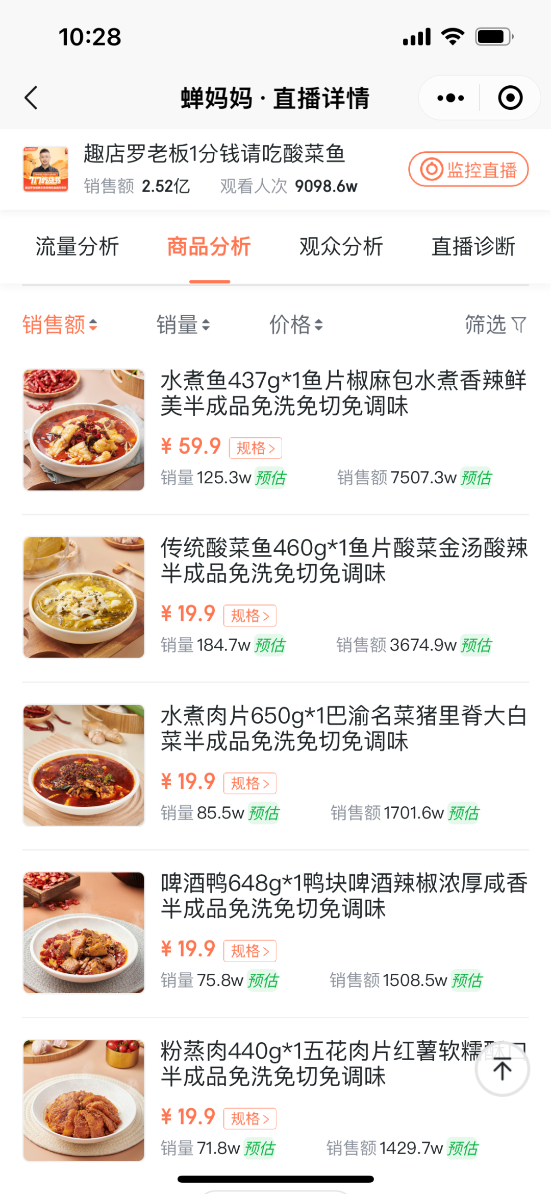如此亮眼的成绩,其中,销量的主力军是59.9元是水煮鱼,单款商品的销量就超过了100万,销售额达到7507.3万。除此之外,酸菜鱼、水煮肉片、啤酒鸭等共9款菜品的销售额都超过了千万。从带货商品可以看出,这场直播是一场预制菜的狂欢盛宴。