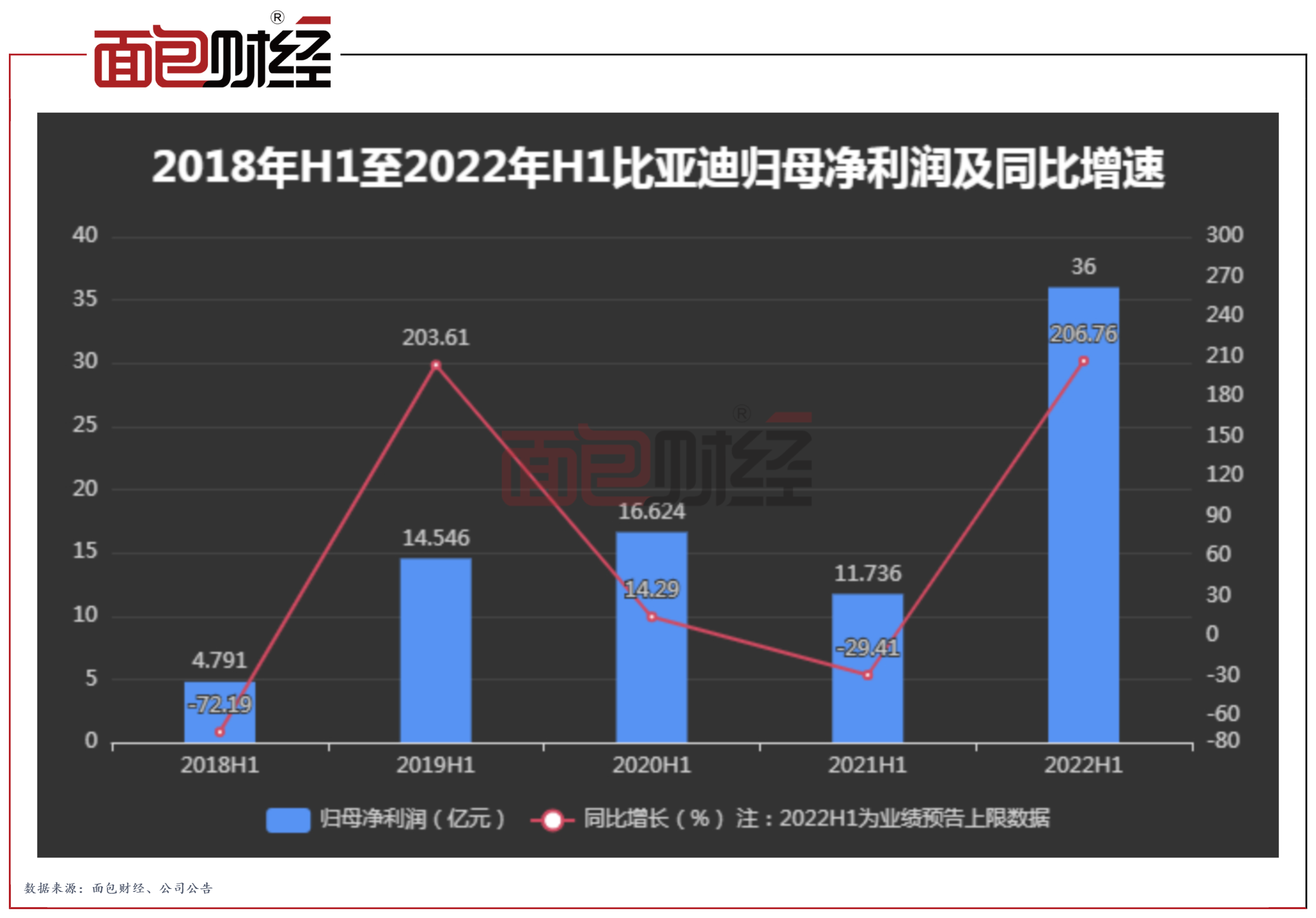 近日,比亚迪发布2022年上半年业绩预告,预计上半年实现归母净利润上限为36亿元,半年利润或接近去年全年。
