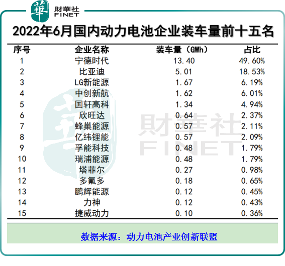 6月份的动力电池行业的一大特点是市场集中度进一步增加。