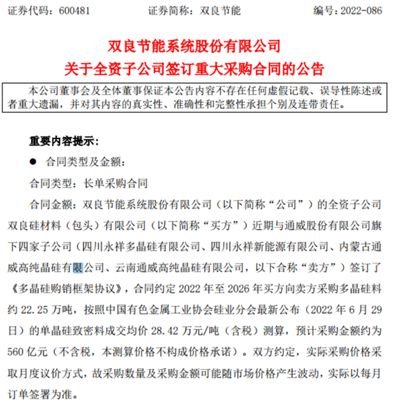 近日,A股上市公司双良节能(600481.SH)公告,全资子公司双良硅材料(包头)有限公司近期与通威股份有限公司旗下四家子公司签订了《多晶硅购销框架协议》,合同约定2022年至2026年买方向卖方采购多晶硅料约22.25万吨,预计采购金额约为560亿元。