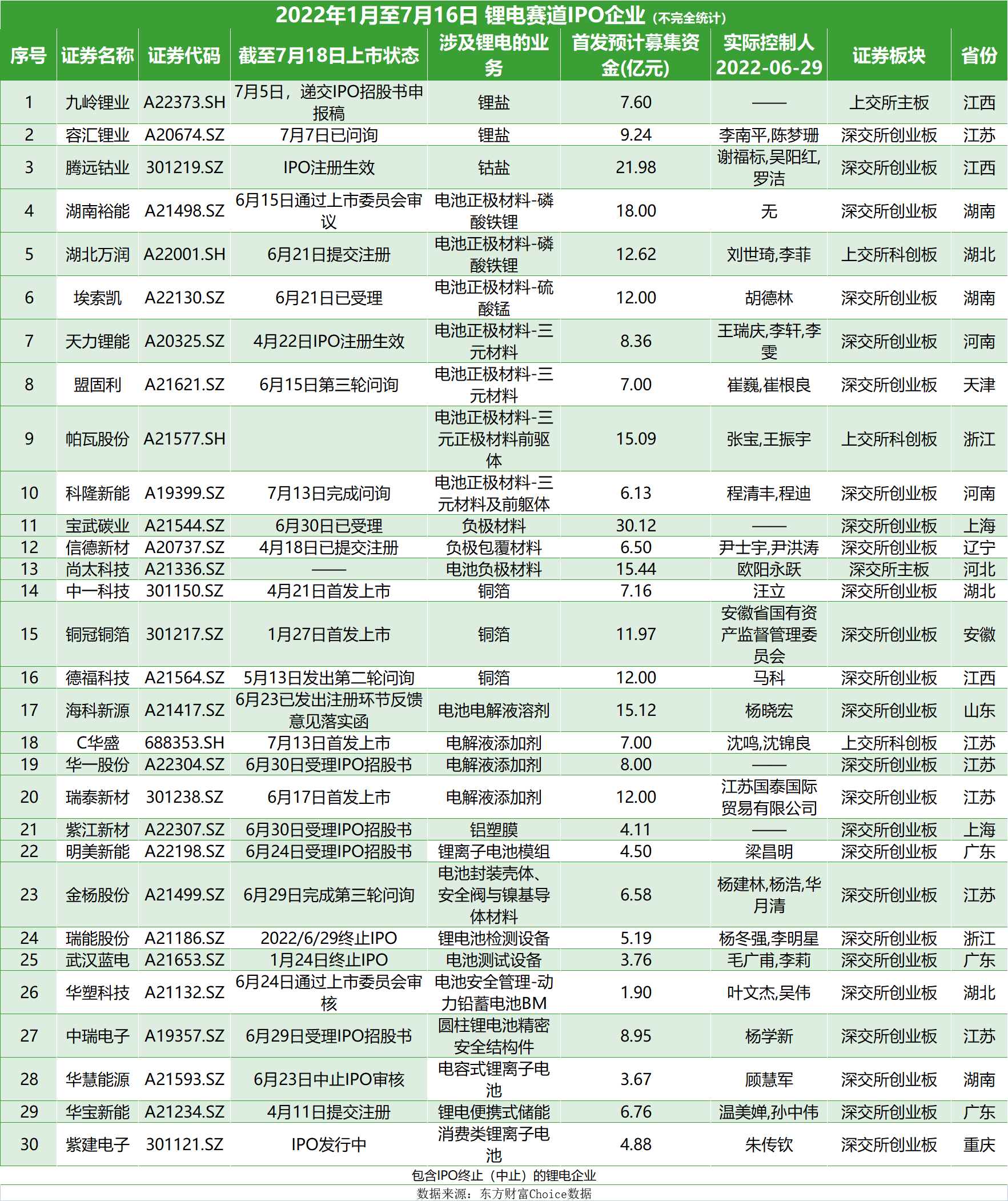 锂电大热,引发锂电赛道的企业纷纷闯关IPO。根据界面新闻统计,2022年以来截至7月17日,已有30家涉及锂电业务的企业欲登陆A股。其中不乏已成功上岸者,如C华盛(688353.SH)、瑞泰新材(301238.SZ)、腾远钴业(301219.SZ)、铜冠铜箔(301217.SZ)、中一科技(301150.SZ)、紫建电子(301121.SZ)。也有3家企业中途离场:瑞能股份(A21186.SZ)、武汉蓝电(A21653.SZ)已终止IPO审核,华慧能源(A21593.SZ)中止审核。