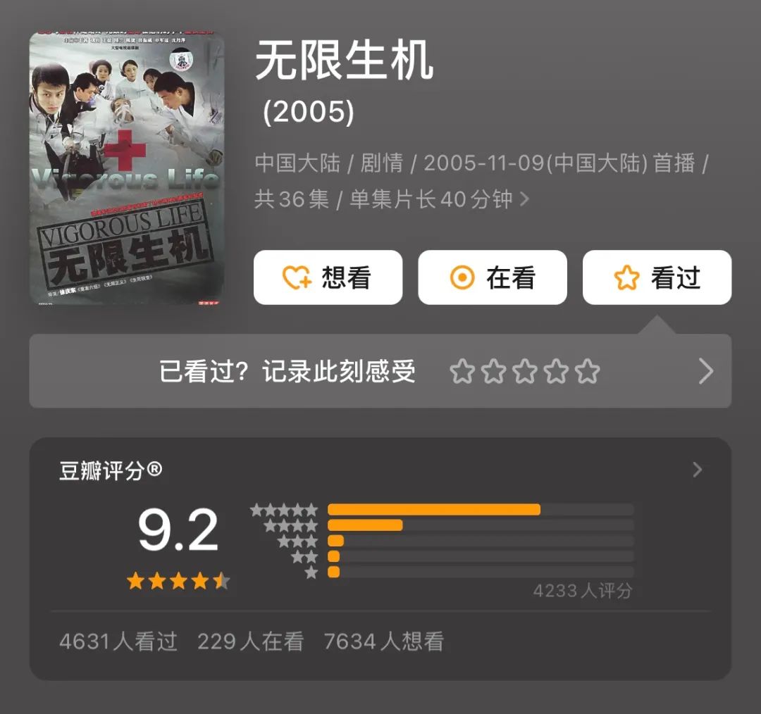 评分方面,国产剧9分以上的医疗剧,仅有一部2005年拍摄的《无限生机》。《心术》豆瓣8.2分,其关注医患矛盾的剧情也在网络上有较高的讨论度,但收视率并不算高,在当年卫视电视剧收率排行中未能跻身前20。