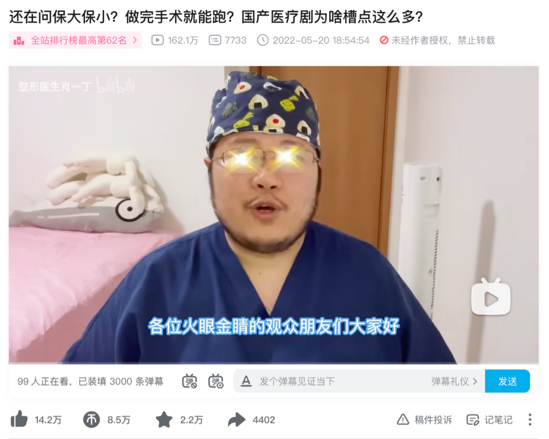 这本该是一部职业剧的基础,如今却是可圈可点的加分项。北京协和医院整形外科医生肖一丁曾在B站发布视频吐槽国产剧常犯的三种错误:细节穿帮,学术错误和理念错误,视频的标题是:还在问保大保小?做完手术就能跑?国产医疗剧为啥槽点这么多?