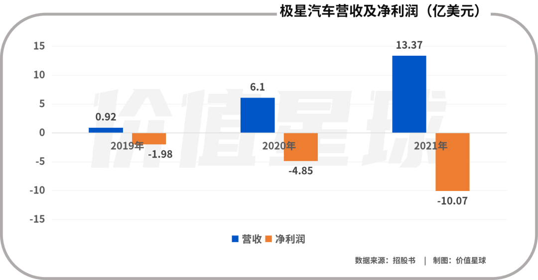 根据极星汽车向美国证券交易委员会(SEC)提交的招股书,2019-2021年,极星汽车营收分别为0.92亿美元、6.1亿美元和13.37亿美元,同比增幅分别为563.04%和119.18%。