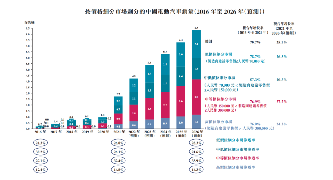 威马就曾在其招股书中公布了中国电动汽车销量与价格的关系。其中,售价在15万元到30万元人民币的细分市场增长最为强劲,2021年的复合年增长率已经达到了27.7%。相比之下去,售价高于30万元的新能源车2021年的增长率为24.3%。