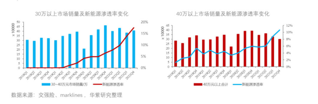 据华紫研究院整理的数据显示,从 2018年到2021年,30万元区间售价的能源车在国内的市场渗透率增加了20%。然而40万元售价及以上的能源车在同样时间段渗透率仅从5%增加至12%。
