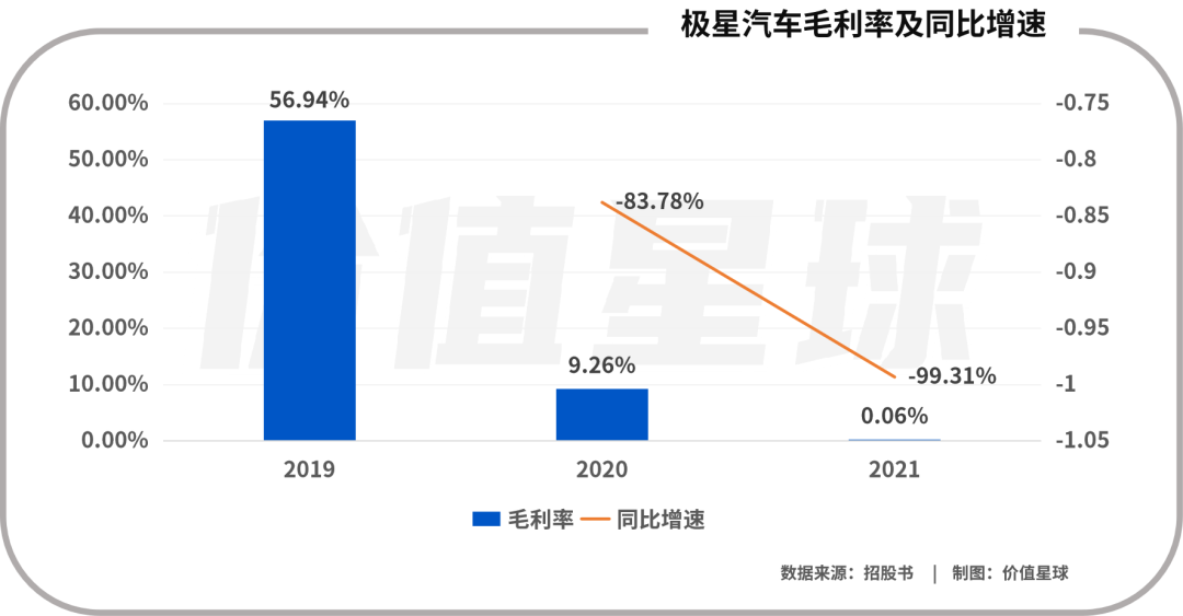 2019-2021年,极星汽车的毛利率分别为56.94%、9.26%和0.06%,从2020年起较上一年降幅分别为83.78%和99.31%。可以注意到,2021年极星汽车的毛利率增速较上一年同比降低了一倍。
